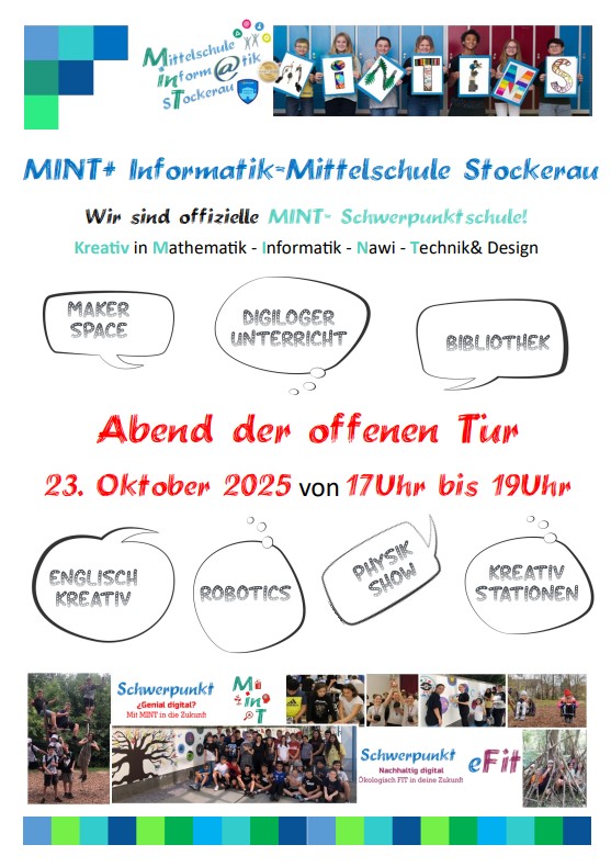 VORANKÜNDIGUNG – Am Donnerstag, 23.10.2025 findet von 17:00 – 19:00 Uhr der Abend der offenen Tür in der Mint- und InformatikMS Stockerau statt.