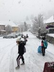 Unser Abreisetag beginnt gleich einmal mit zwei Überraschungen: Alles ist weiß draußen! Und es schneit nach wie vor, kinderhandtellergroße Flocken sogar. Als zweite Überraschung steht ein kleiner Hund am Balkon, der dem Frauerl ausgebüxt ist und sich von den Mädels der Zimmer auf dieser Seite des JUFA Murau Streicheleinheiten holt.