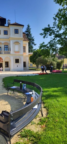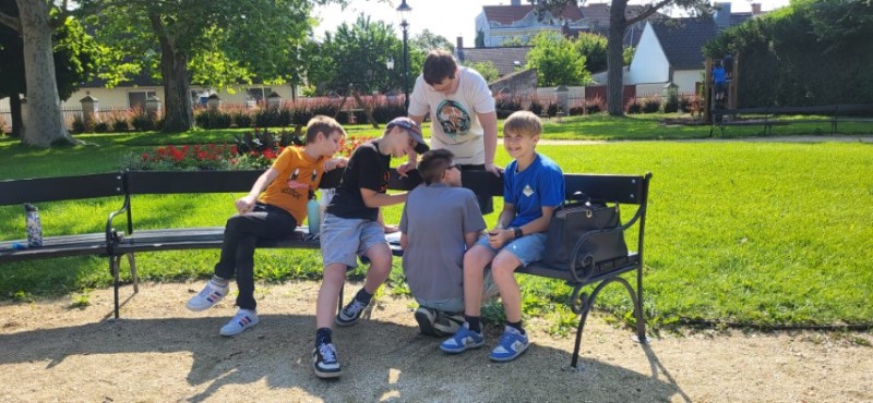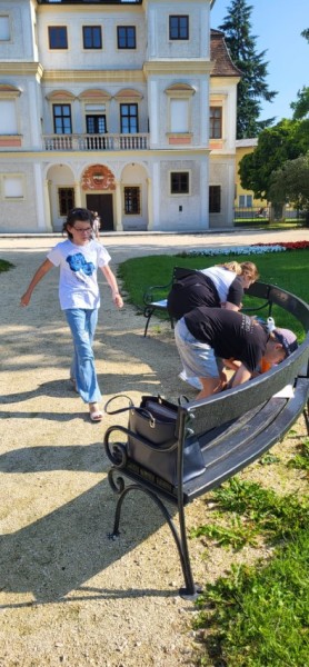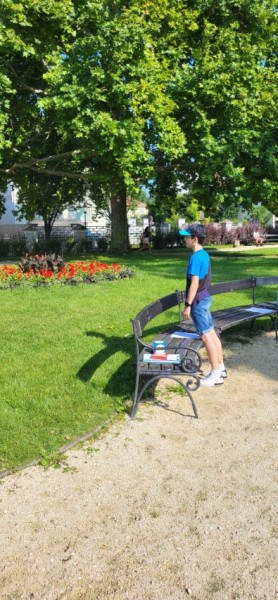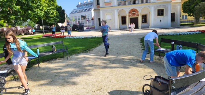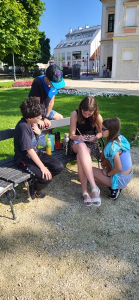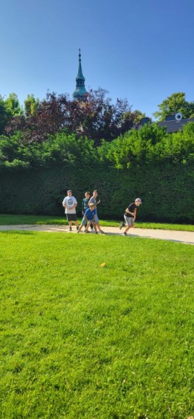 Zum Abschluss kamen wir wieder ins Laufen. Mit einer Variante von „Stille Post.“ An einem Ende des Parks war ein Gedicht angebracht, welches vom „Leser“ jedes Teams gelesen wurde. Am anderen Ende des Parks saß der „Schreiber“ an einem Tisch. Dazwischen 2-3 „Läufer“, die das Gedicht vom Leser zum Schreiber weitersagen sollten. Und dazu mussten sie laufen. Natürlich ging dabei einiges auf dem Weg verloren. Und veränderte sich. Aus „ohne was herum“ wurde „Ohne Wasser rum“, aus dem „Lattenzaun“ ein „platter Clown“. So ergaben sich wahre Meisterwerke der modernen Dichtkunst.