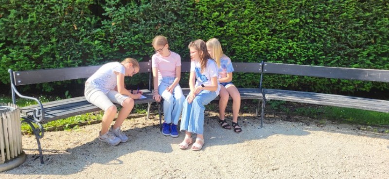 Etwas außer Atem beruhigten wir uns mit einer kreativen Übung: Eine Reizwortgeschichte über die Sommerferien. Berg, See, genießen, Abenteuer, Sommerferien – mit diesen vorgegebenen Worten sollte eine Geschichte erfunden werden. 100 Wörter in 8 Minuten! Da liefen die Köpfe heiß. Es wurde überlegt, diskutiert, geschrieben, durchgestrichen und radiert und wieder geschrieben. Dabei entstanden teils fantastische, teils realistische und ur-komische Geschichten, von denen die Besten laut vorgelesen wurden.