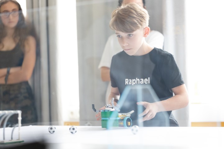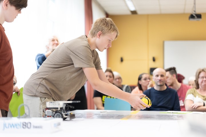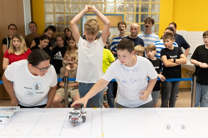 Unser 2. Schuleigener Robotics Wettbewerb ist über die Bühne gegangen! Am Mittwoch, den 12.6. stand der ganze Tag im Zeichen von Robotics: Schon vormittags übten die teilnehmenden Teams und feilten an letzten Details. Nach einer Mittagspause ging es dann am Nachmittag richtig los, kurz vor 16 Uhr öffneten sich die Türen für die zahlreich erschienenen Zuschauer. 20 (!) Teams stellten sich letztendlich dem Bewerb, der mit der Vorrunde begann. In dieser trat jede Mannschaft zweimal an, die 8 Teams mit den meisten Punkten durften in die nächste Runde aufsteigen. Jedes Antreten dauert höchstens 2 Minuten 30 Sekunden und in dieser knappen Zeit müssen 3 Aufgaben bewältigt werden: Zunächst muss ein Beebot so programmiert werden, dass er den vorgegebenen Weg möglichst fehlerfrei zurück legt. Dann darf der Legoroboter aus seinen Startlöchern und muss ebenfalls Felder abfahren, am Ziel ein Legoteil aufladen und wieder zurück an den Start fahren. Für das Überfahren von Linien gibt es Punktabzüge. Der dritte Teil zeigte sich inspiriert von der aktuellen Fußball EM, denn derselbe Roboter musste nun drei Fußbälle in ein kleines Tor schießen.