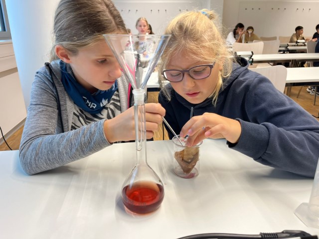 Währenddessen lernte die 1 Mint B, wie man ein eigene Handcreme herstellen kann und tauchte im Workshop „Das kannst du dir in die Haare schmieren“ in die Welt der Naturkosmetik ein. Als Erinnerung durften die Kinder ihre eigene kleine Creme mit den selbst ausgesuchten Aromen in einer selbst gestalteten kleinen Dose mit nach Hause nehmen. Zusätzlich wurden die Kinder anschließend darüber informiert, ob man alte Textilien großindustriell recyclen kann.