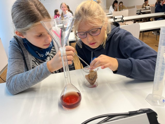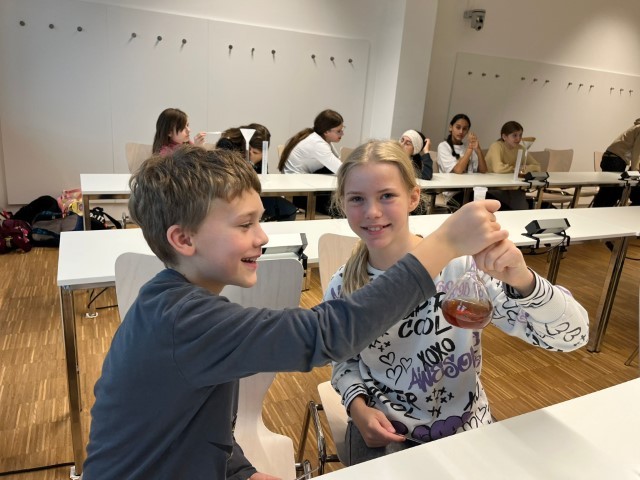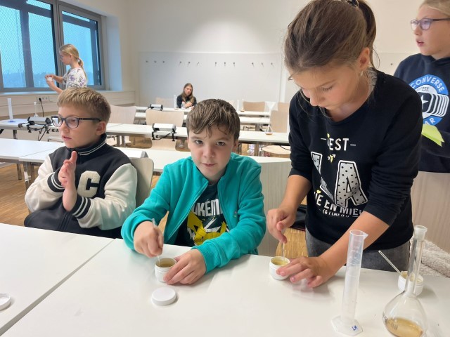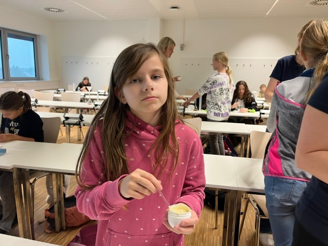 Währenddessen lernte die 1 Mint B, wie man ein eigene Handcreme herstellen kann und tauchte im Workshop „Das kannst du dir in die Haare schmieren“ in die Welt der Naturkosmetik ein. Als Erinnerung durften die Kinder ihre eigene kleine Creme mit den selbst ausgesuchten Aromen in einer selbst gestalteten kleinen Dose mit nach Hause nehmen. Zusätzlich wurden die Kinder anschließend darüber informiert, ob man alte Textilien großindustriell recyclen kann.