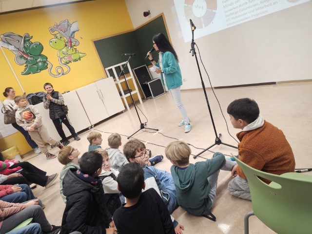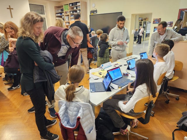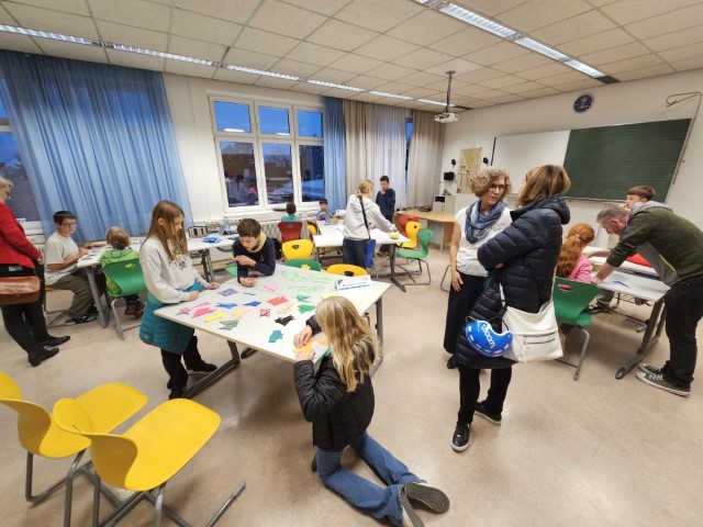 Schon am Vormittag hatten uns etliche Klassen aus den umliegenden Volksschulen besucht und hier schon Mitmachstationen vorgefunden, etwa „Green Screen Fotos“. Jetzt am Abend kamen die Kinder mit ihren Eltern, um sich ein Bild von ihrer möglichen zukünftigen Schule zu machen.