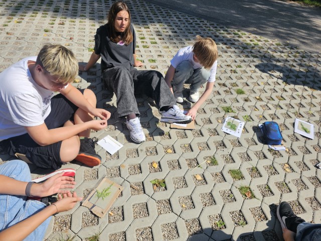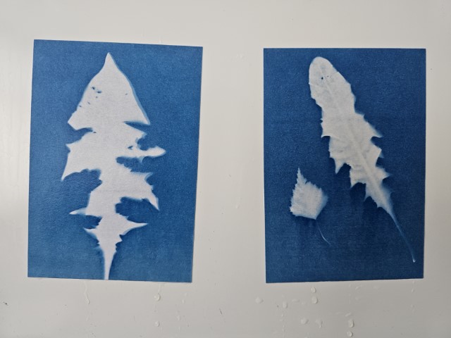In der 4Mint starteten wir heuer im Fach MINT mit dem Thema Fotografie – mit ganz simplen Mitteln zunächst. Wir stellten ein Fotogramm her! Auf lichtempfindliches Papier (hier haben wir fertig vorbereitetes gekauft, in einem späteren Schritt werden wir auch selbst eine lichtempfindliche Schicht herstellen) legten die Schüler:innen Materialien aus der Natur, wie Blätter, Gräser, aber auch ein Geodreieck oder ähnliches wurde benutzt. Dann als Schutz gegen Verschieben eine Plexiglasplatte drauf und ab in die Sonne! Diese durfte dann etwa 20 Minuten einwirken, dann wurden die Werke wieder in den Klassenraum getragen und die nunmehr bereits verfärbten lichtempfindlichen Papiere mit Wasser ausgespült – das stoppt die Reaktion und das Bild erscheint klar und deutlich: Belichtete Stellen werden tiefblau, abgedeckte Stellen weiß. Die Blätter, Gräser etc. erscheinen also als weiße Stellen, quasi ein Negativ. Der Name Fotogramm ist somit erklärt: Licht hat gezeichnet! Die blaue Farbe, die bei der chemischen Reaktion mit den Eisensalzen entsteht, ist verantwortlich für die Bezeichnung „Eisenblaudruck“.