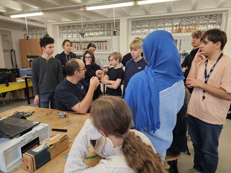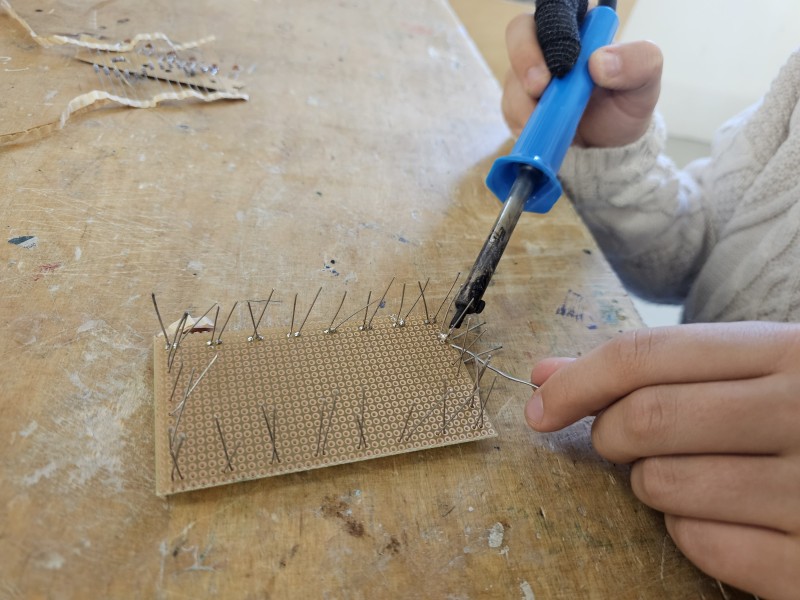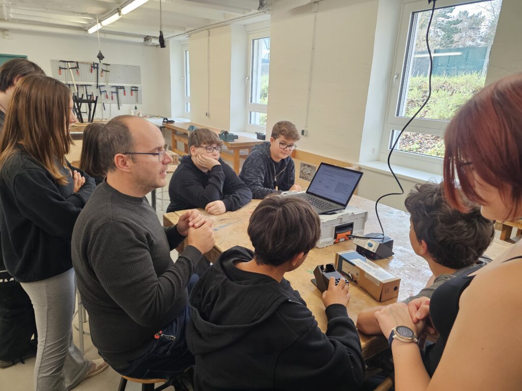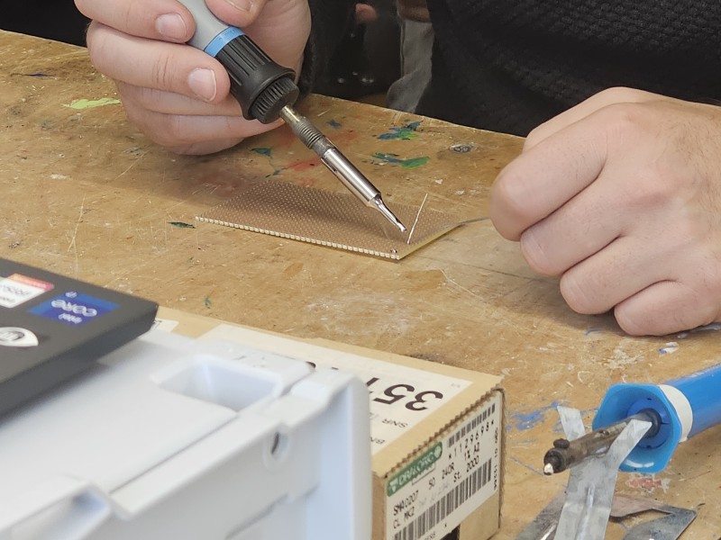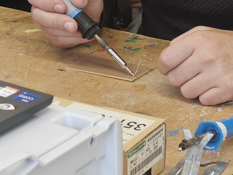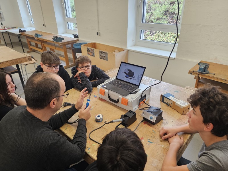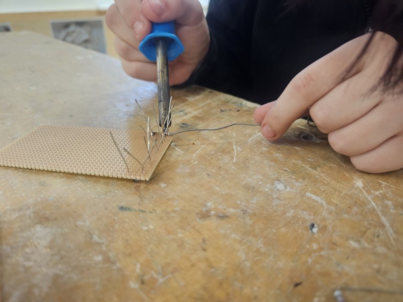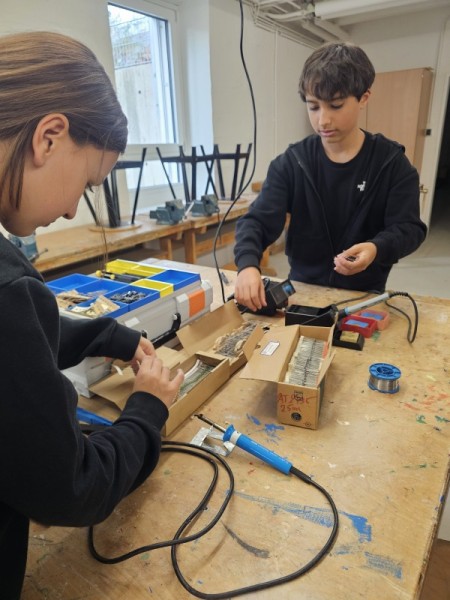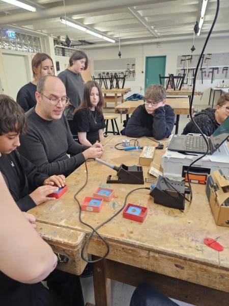 Was im Werkunterricht (Technik und Design) in der 4.Klasse gefordert ist, muss richtig erlernt werden. Da trifft es sich gut, dass uns im Rahmen der Kooperation der MINT Klassen mit der HTL Hollabrunn Herr Thomas Buchgraber zur Verfügung stand, der in der Elektrotechnikwerkstätte in der HTL intensiv mit Löten zu tun hat.