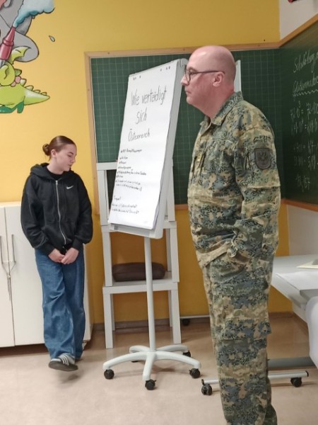 Workshop zum Thema „Umfassende Landesverteidigung“ für die vierten Klassen der MINT – und Informatik – Mittelschule Stockerau von Oberst Jürgen Schlechter (Kommandant der Kaserne Korneuburg)